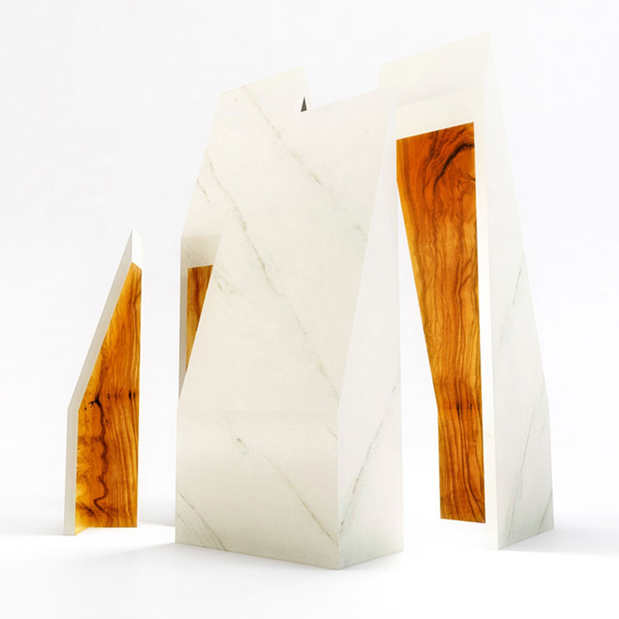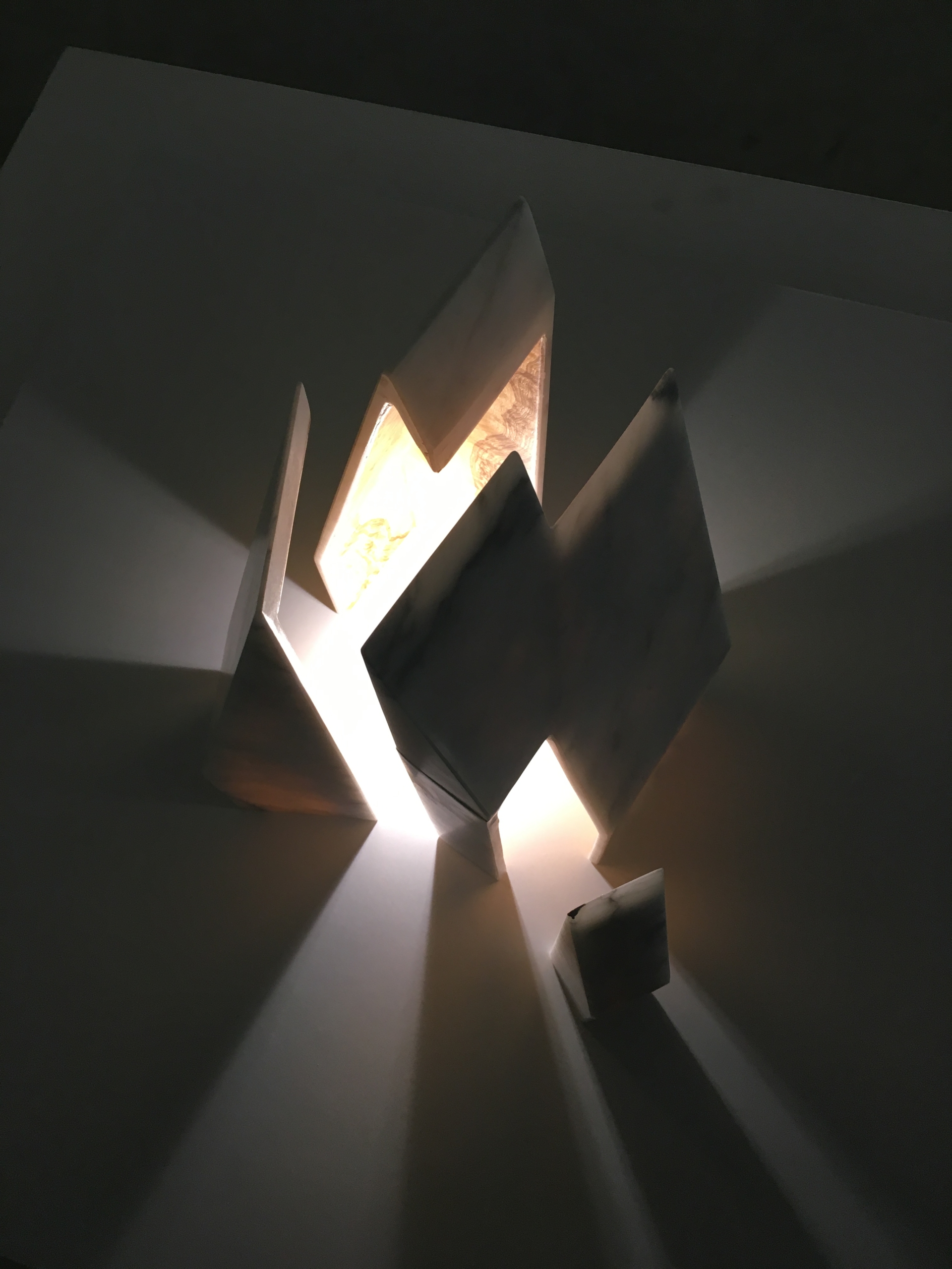 La luce nell’architettura è tutto: colore, forma, spazio e movimento. Dai grandi maestri dell’architettura e del design ai più eclettici esponenti delle arti figurative, questa protagonista indiscussa è stata elevata ai gradini più alti della critica e dell’espressione in ogni sua forma. Il bianco è per definizione “luce”, contrapposto al nero che ne preclude la presenza. #Lesson1 rappresenta una lampada/installazione che ritaglia un piccolo momento di riflessione sull’essenza della luce, sul suo esser presente nello spazio, sul suo propagarsi in infiniti modi. Dall’archetipo della casa, inteso come rifugio solido e indistruttibile (marmo bianco di Carrara) agli spazi confortevoli e rassicuranti dell’abitare (legno di ulivo).