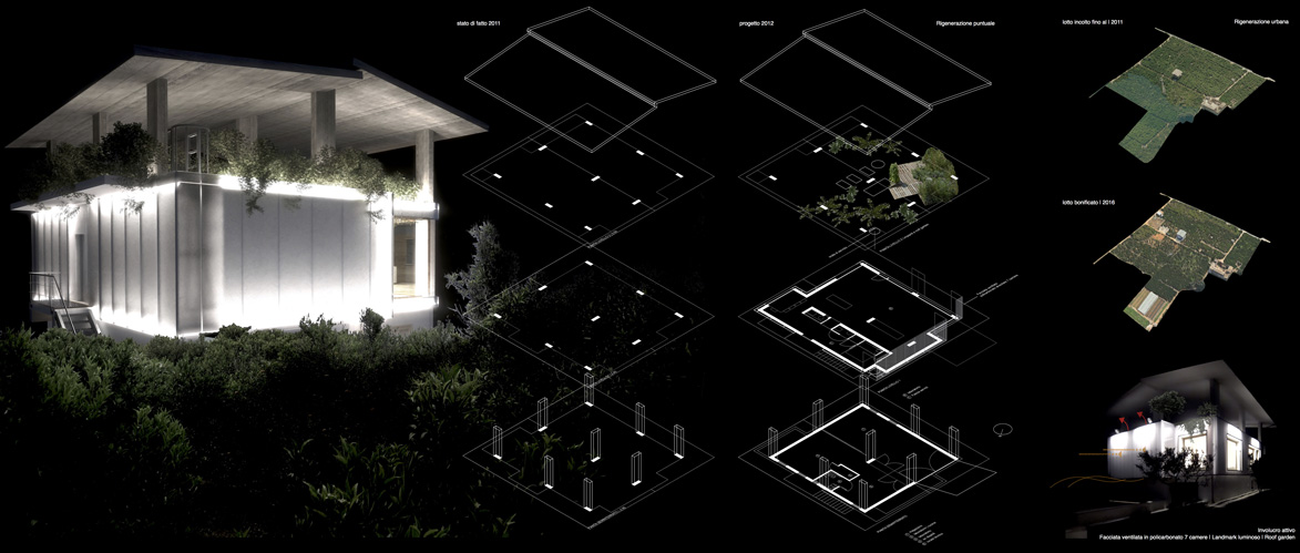 Il progetto prevede la chiusura dei livelli -1 e 0, con un sistema di facciata ventilata realizzata in pannelli di policarbonato alveolare ad alte prestazioni termiche. La “pelle” semitrasparente permette un sistema d’illuminazione per la trasformazione radicale della volumetria del manufatto, da edificio simbolo dell’illegalità a faro per la legalità.